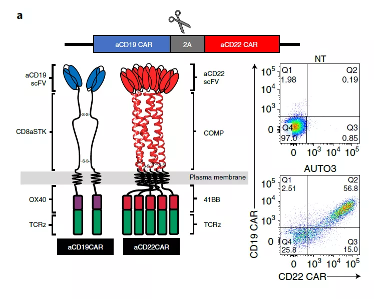 2021年10月12日,Nature Medicine期刊上公布了抗CD19和抗CD22 CAR的自體轉(zhuǎn)導T細胞(AUTO3)在復發(fā)性或難治性B-ALL(n=15)的兒童和年輕成年患者中的I期試驗,以評估AUTO3的療效。