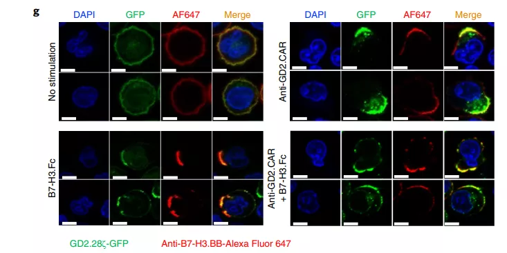 在共聚焦顯微鏡成像顯示CARs在表達GFP標記的GD2.28ζ(綠色)和B7-H3.BB(紅色)的T細胞中聚集,能夠靶向神經(jīng)母細胞瘤細胞,并觀察殺傷效果。在隨后植入了神經(jīng)母細胞瘤的小鼠上,也驗證了雙靶向CAR-T細胞療法的優(yōu)異抗腫瘤結(jié)果。